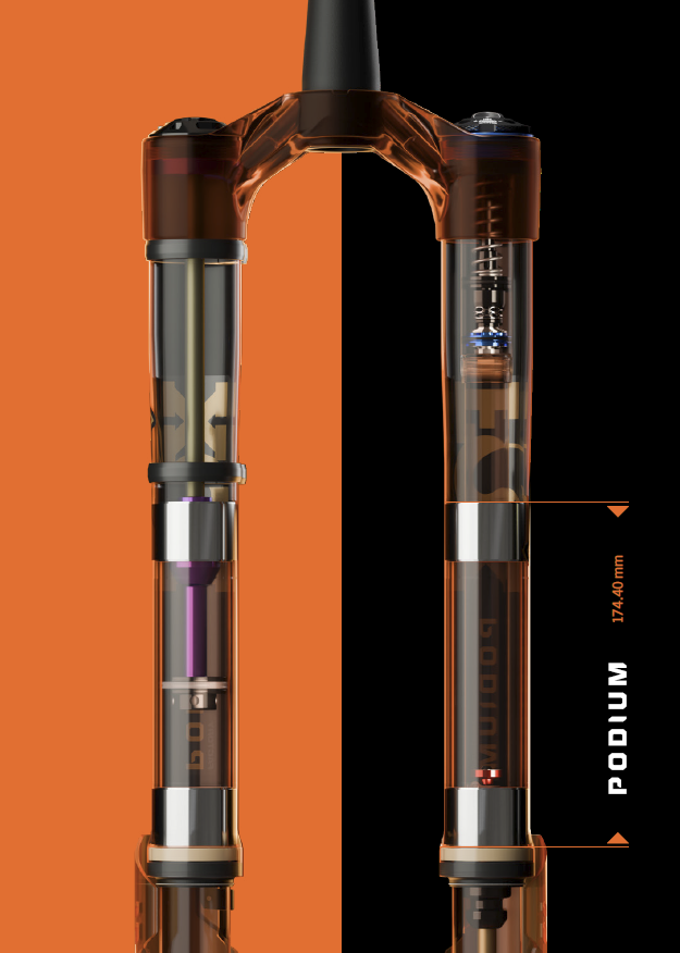 Para aumentar ainda mais a rigidez torcional, a FOX substituiu o eixo padrão de 15mm por um eixo de aço 20 x 110mm Boost DH, distribuindo as forças de maneira mais uniforme na junção com a parte inferior. Com 175mm de sobreposição das buchas — 32% a mais que na FOX 38 e até 7% a mais que na própria FOX 40 — a Podium oferece um chassi imbatível em rigidez e com atrito reduzido sob cargas elevadas.