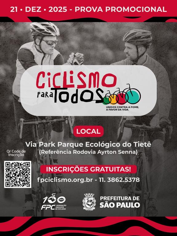 São Paulo (SP) – O Ciclismo para Todos será uma prova promocional, aberta ao público geral, sem necessidade de filiação para participação. O evento acontecerá no dia 21 de dezembro de 2025, na Via Park – Parque Ecológico do Tietê (referência: Rodovia Ayrton Senna, sentido São Paulo), em percurso de 6 km por volta.