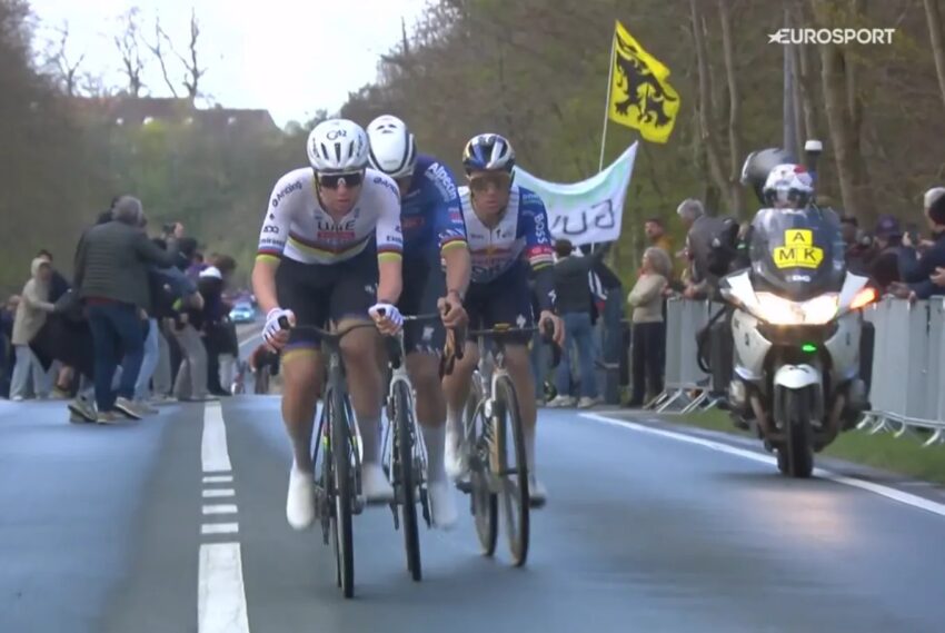 Até então, ambos haviam trabalhado juntos para manter Remco Evenepoel sob controle, que tentava se recuperar e voltar à disputa pela vitória. Van der Poel admitiu que o ritmo do belga nunca ficou totalmente claro durante a corrida. “Não olhei para trás; só vi depois na TV o quão perto ele estava. Me revezei na frente, mas sem exagerar. Tadej manteve um ritmo muito forte o tempo todo. Foi muito difícil.”