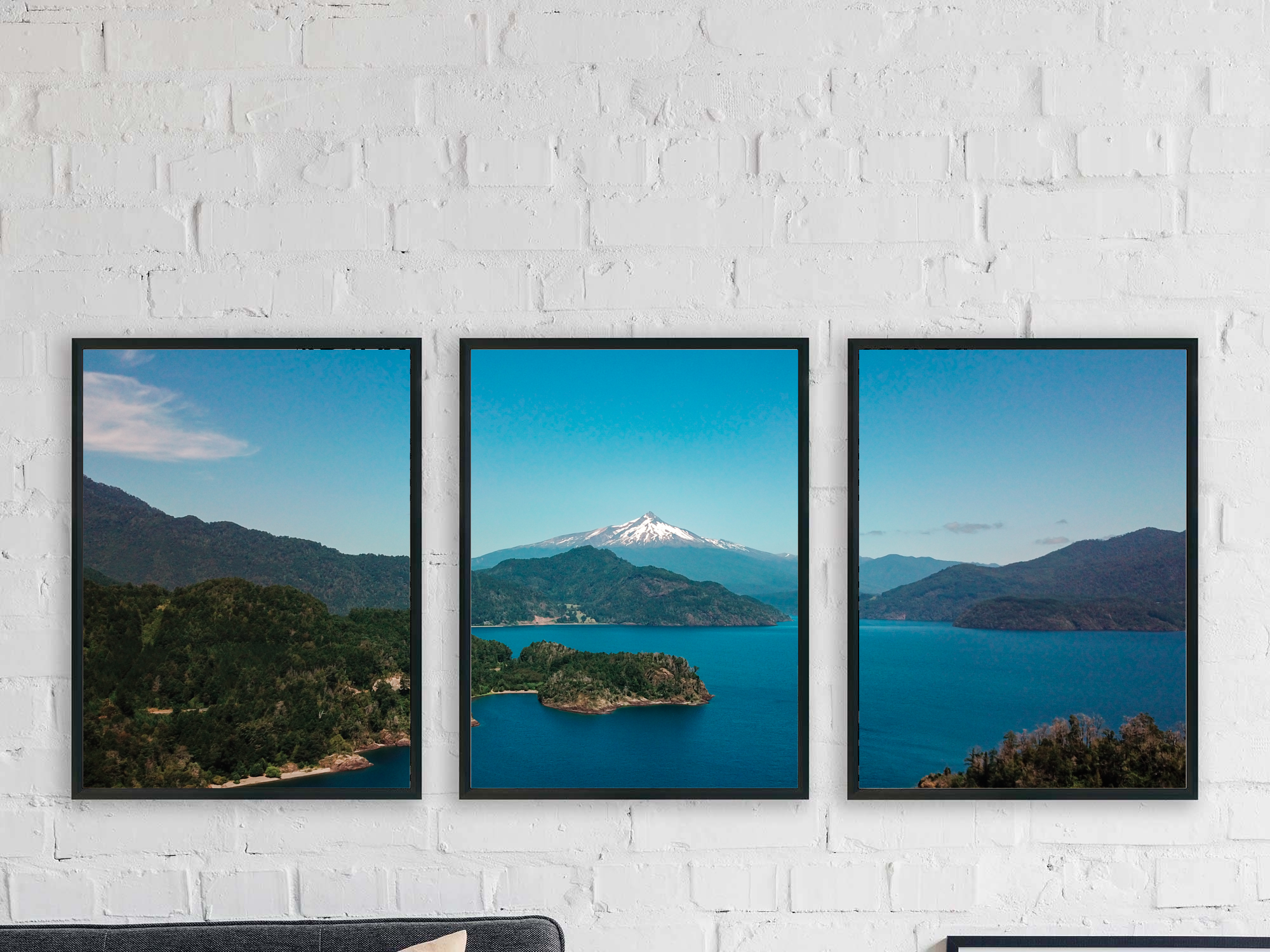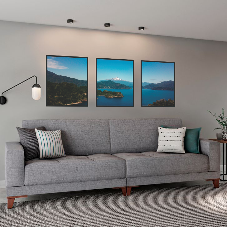 Cada imagem tem a medida de 34 x 46 cm. Elas devem ser posicionadas a 6,5 cm entre elas. O espaço total que elas vão ocupar é de 117 x 46 cm.