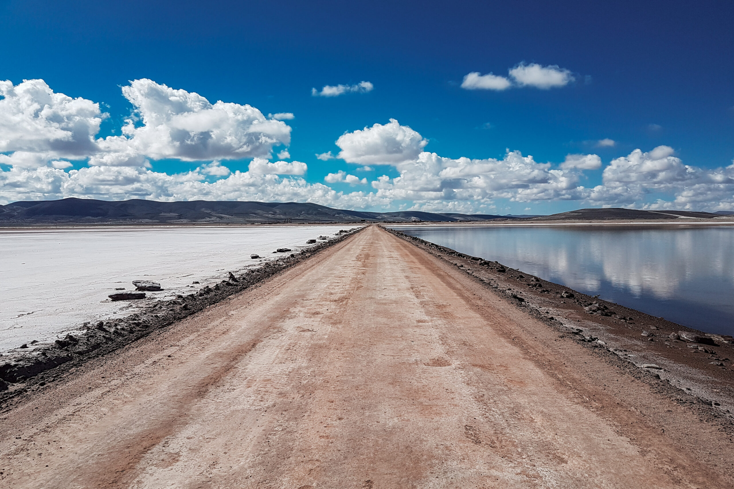 nessa estrada você tem salar dos dois lados, a diferença é que de um lado o sal está seco, do outro lado ainda estava alagado. Era questão de alguns dias sem chuva para que os dois ficassem secos, ou algumas chuvas a mais, para que os dois lados ficassem alagados.